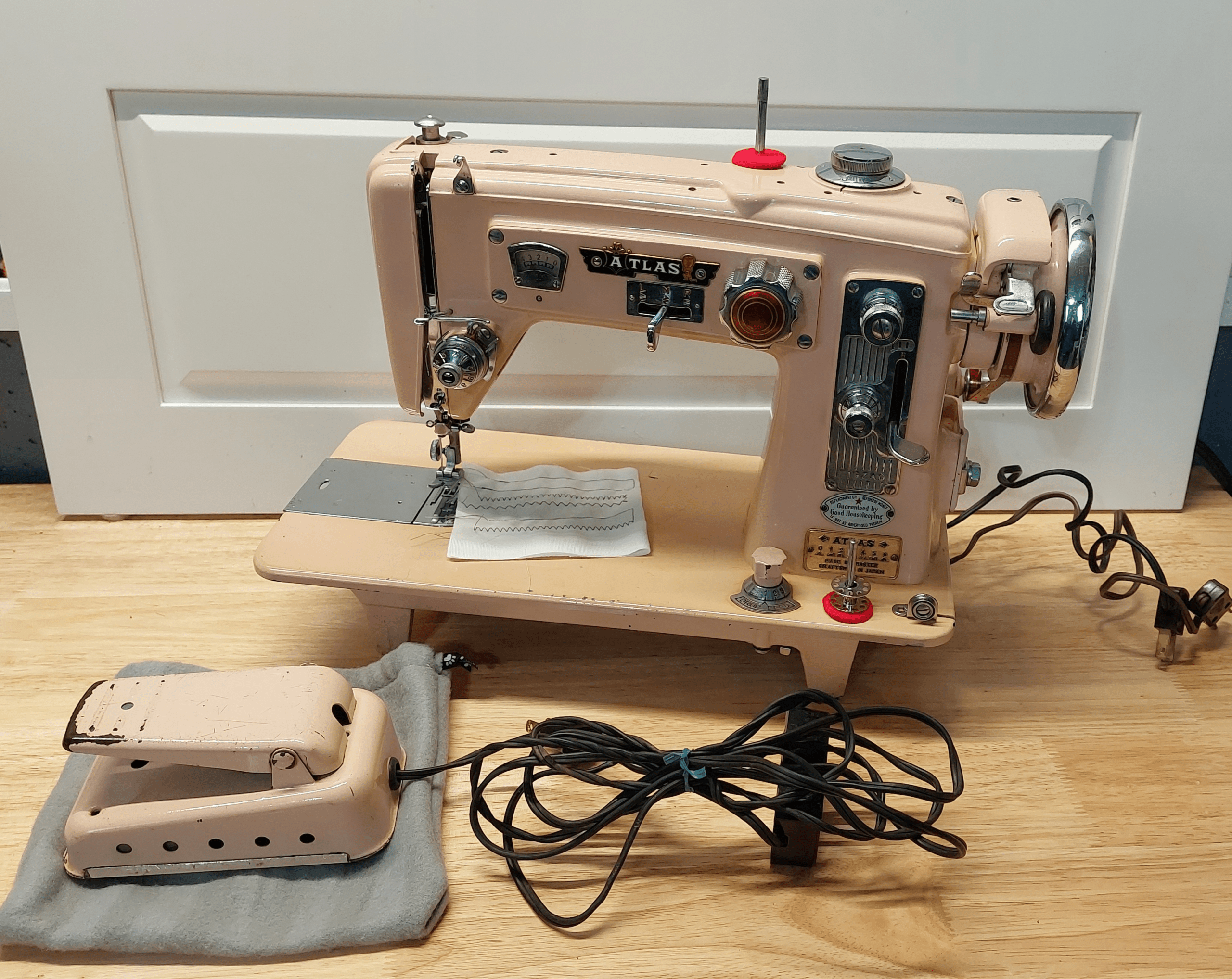 This pink Atlas Select-O-Matic sewing machine has been professionally cleaned, oiled, adjusted, and test-sewn, and produces a beautiful, consistent stitch for both straight and specialty stitches.