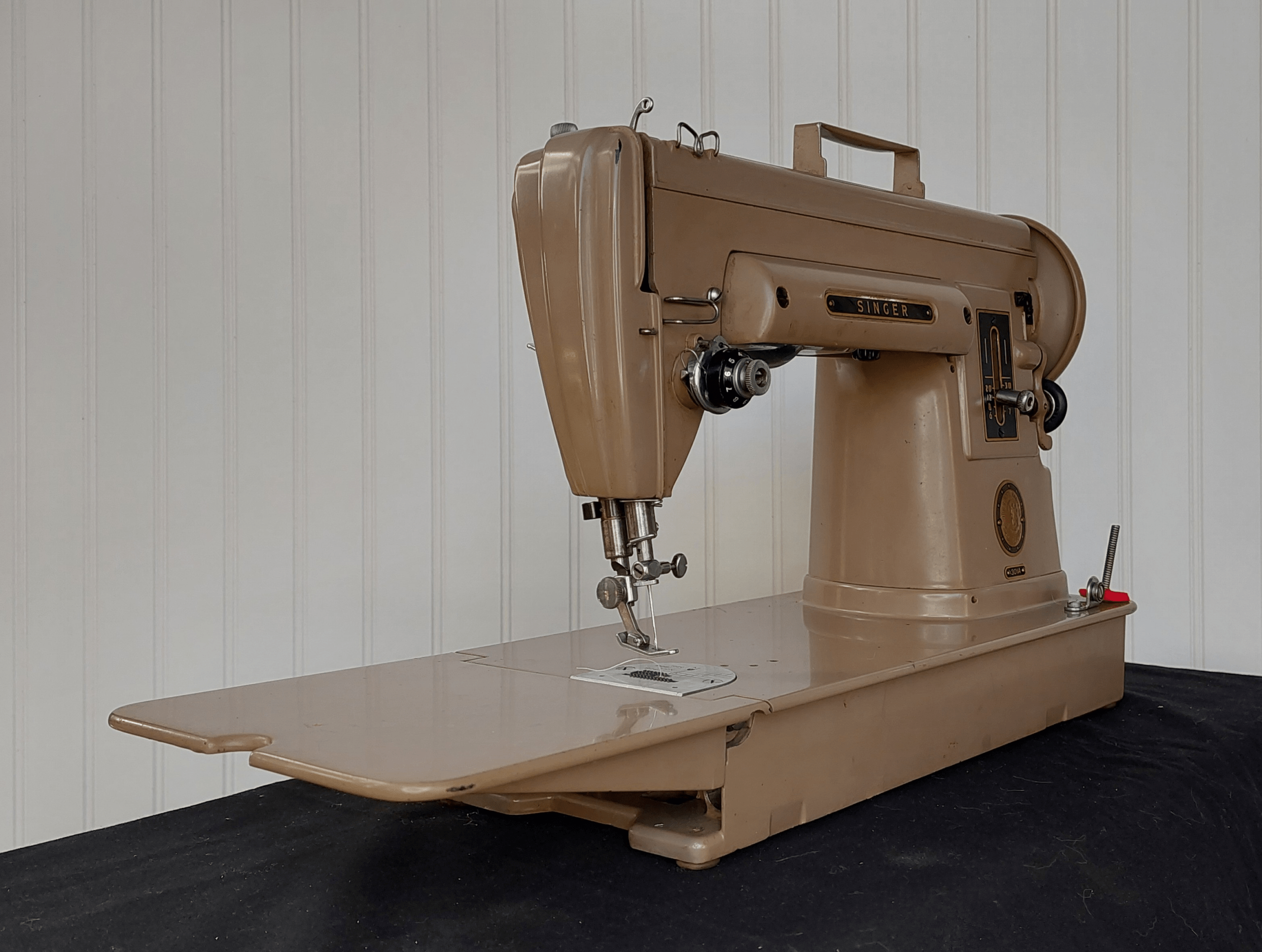 This tan Singer 301A “Mocha” comes with the original vintage bobbin case, foot pedal, and accessories. Prized for its visibility from the slant-needle design and portability at 16 pounds, this full-size sewing machine is a long-bed model manufactured in 1955 in Anderson, South Carolina.